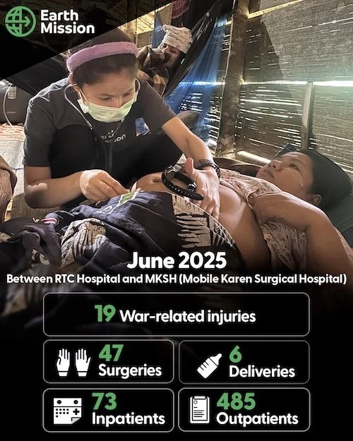 In June, RTC saw 378 outpatients, admitted 55 patients, performed 43 surgeries, and delivered 6 babies. Four patients were referred to Thailand for advanced care, including one for an eye injury and one for orthopedic care.