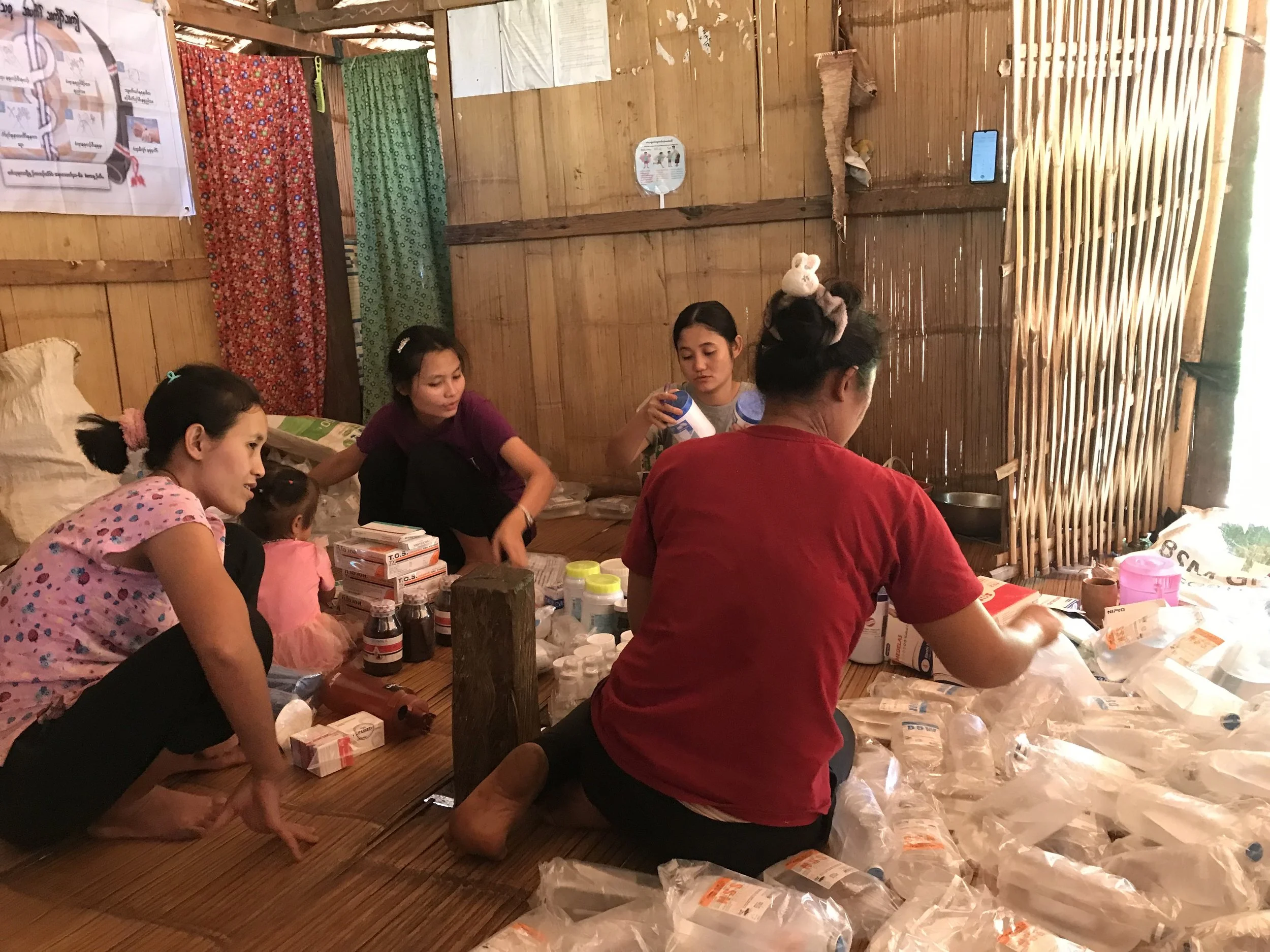 Naw Eh Sel Gay (2nd from right) teaches healthcare workers how to categorize medications.